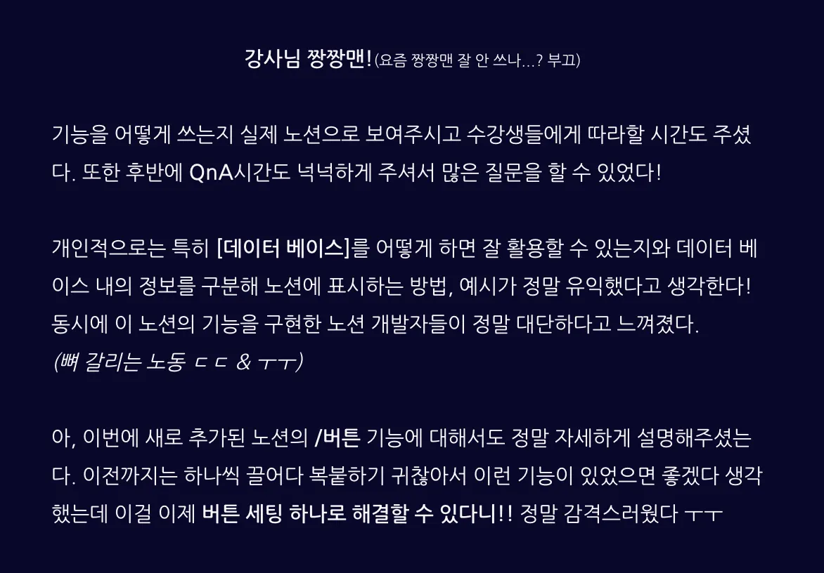 나 빼고도 많은 수강생들이 가려운 부분이 시원해졌다, 이제 더 제대로 쓸 수 있어서 정말 감사하다 등의 평을 줌(ZOOM) 채팅창으로 올려줬고 나도 그 수강생들의 말에 적극 공감했다.