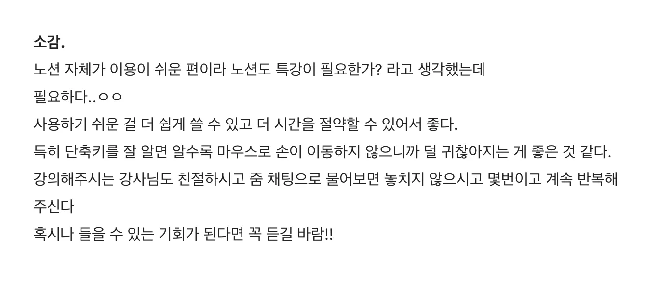 강의해주시는 강사님도 친절하시고 줌 채팅으로 물어보면 놓치지 않으시고 몇번이고 계속 반복해주신다