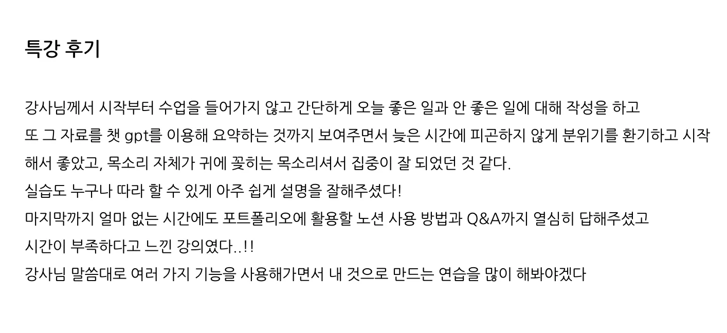 또 그 자료를 챗 gpt를 이용해 요약하는 것까지 보여주면서 늦은 시간에 피곤하지 않게 분위기를 환기하고 시작해서 좋았고, 목소리 자체가 귀에 꽂히는 목소리셔서 집중이 잘 되었던 것 같다.