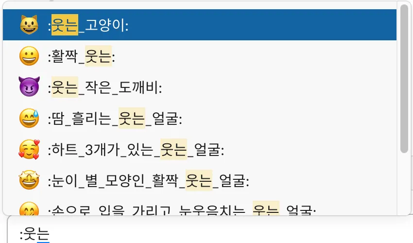 또는, 메시지 창에 : 를 입력하고 원하는 내용을 적으면 이모티콘을 찾을 수 있어요!