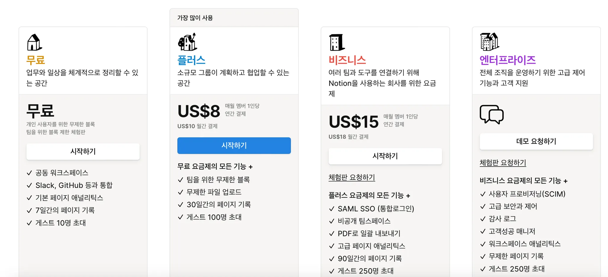 노션 요금제는 아래 사진처럼 4가지로 나눠져있어