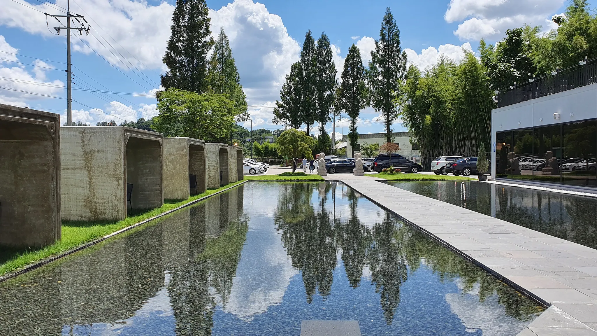 맑은 날 얕은 물 위로 하늘이 반사되어 이쁜 뷰를 연출하는 대형 카페