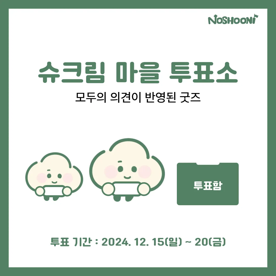 슈크림 마을 투표소 오픈 예정일 : 2024. 12. 15(일) ~ 2024. 12. 20(금)