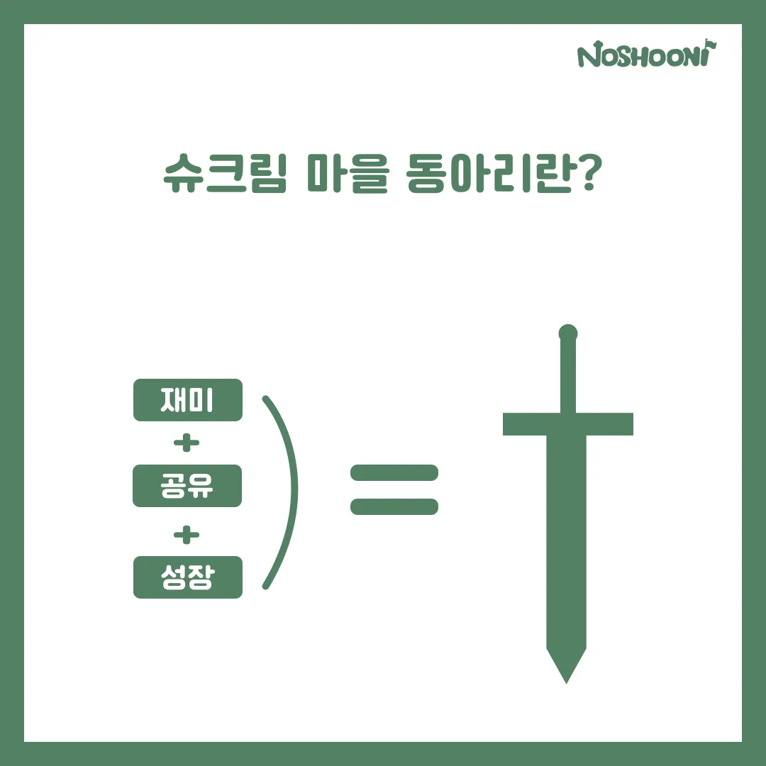 슈크림 마을의 동아리를 모르는 슈크림들을 위해 설명하자면 슈크림 마을 핵심 가치인 재미 공유 성장을 바탕으로 강력한 ‘나만의 무기’를 만들 수 있으며, 동아리의 리더인 ‘제빵사’와 함께 성장하기 위해 모인 동아리 활동이라고 합니다!