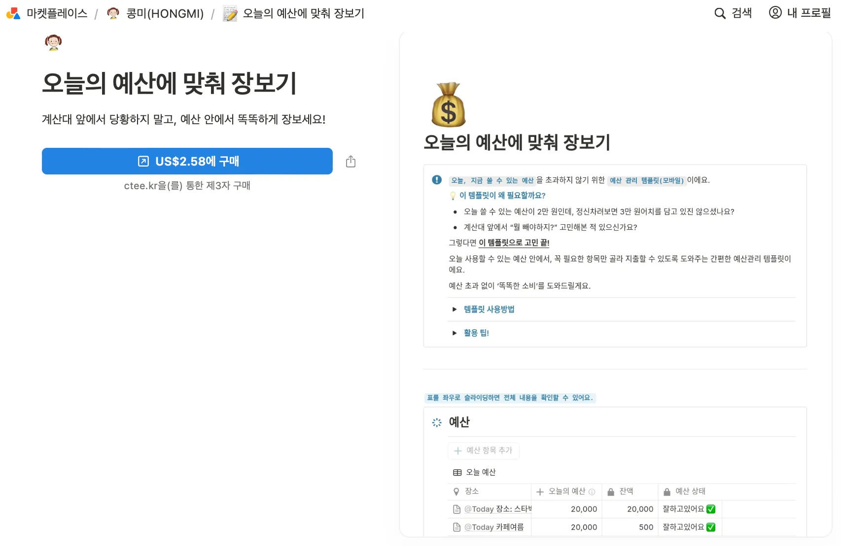썸네일 이미지를 누르면 템플릿 판매 페이지로 연결돼~ o('▽')/☆゚’