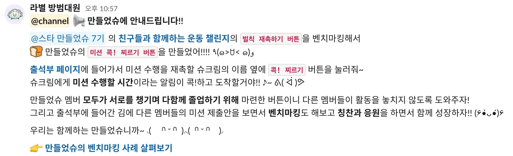 만들었슈의 멤버 스타의 템플릿을 벤치마킹해 만들었슈 출석부의 미션 알림 버튼이 생겼어!