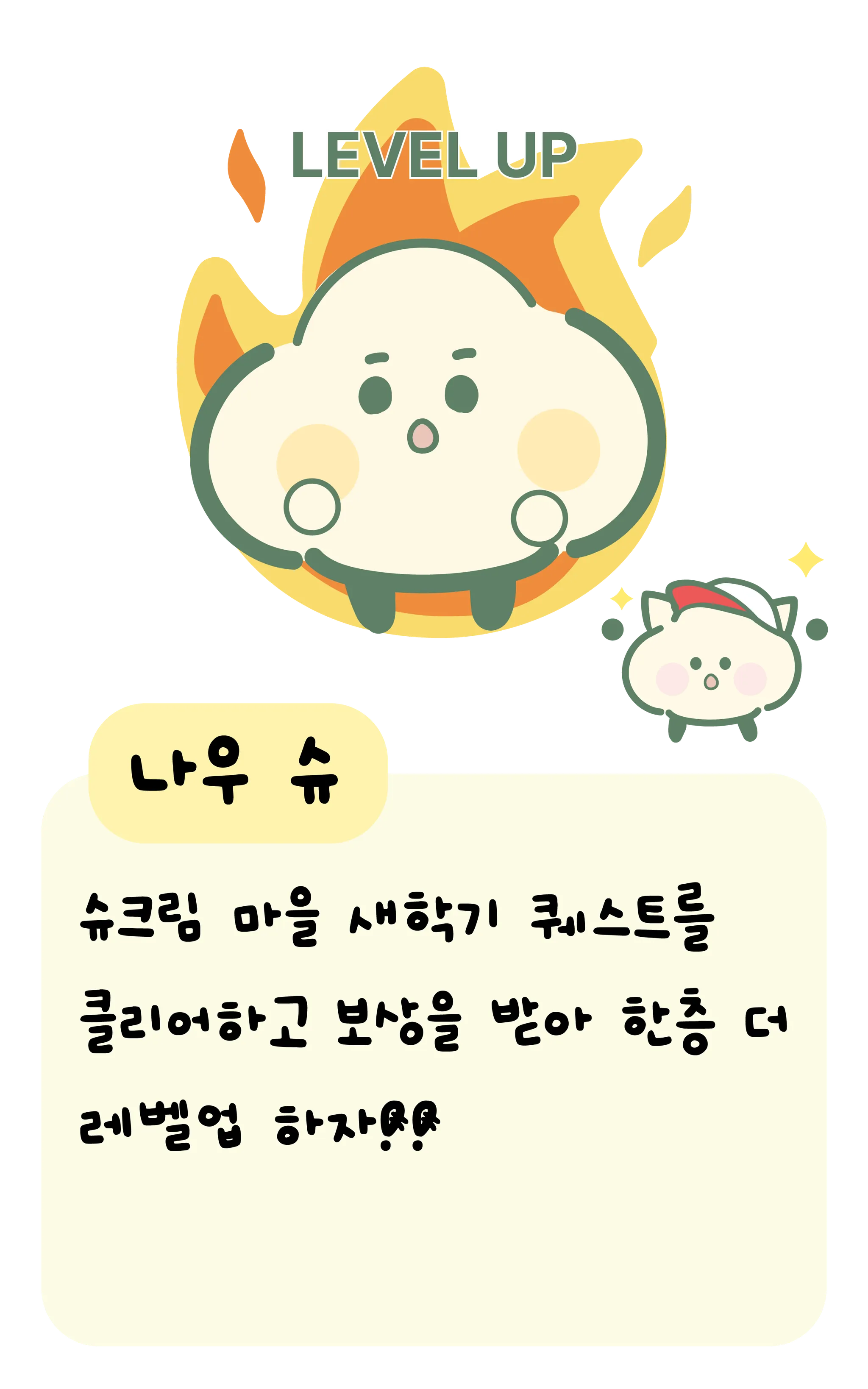 그럼 특별한 새학기 퀘스트를 시작해 보자! 슈크림 마을에는 이번 새학기를 맞이해 슈크림들의 성장을 도와줄 이벤트가 준비되어 있어!"
