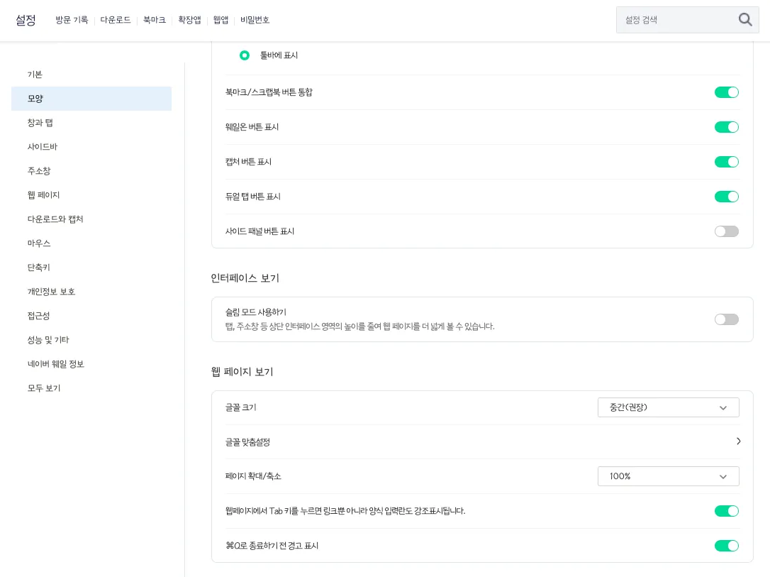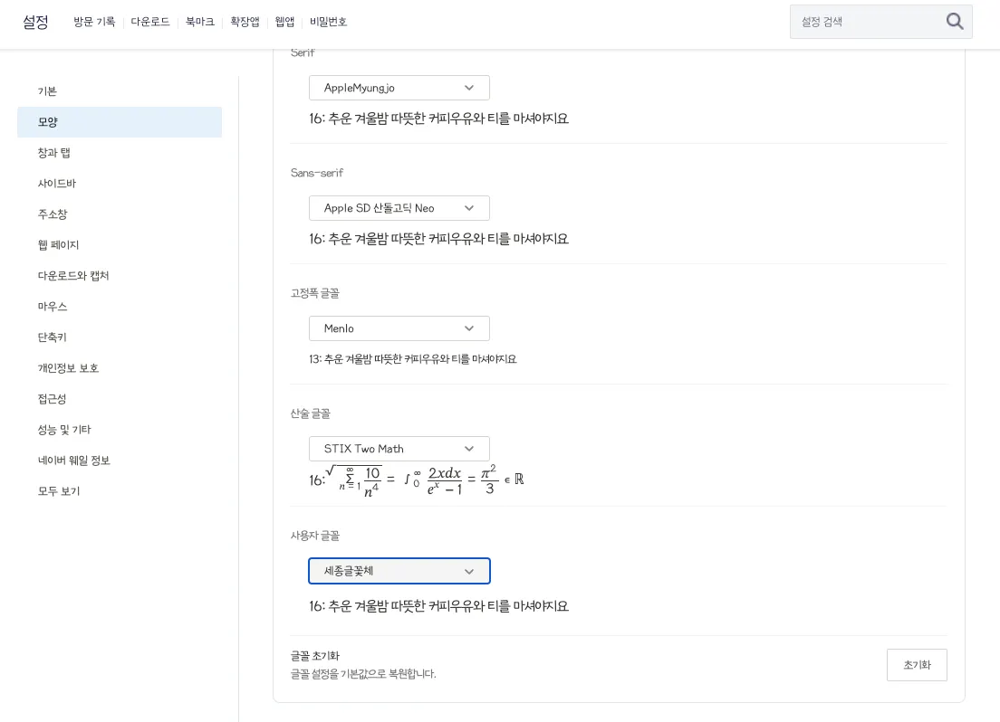 쭉 내려보면 웹페이지 보기에 글꼴 맞춤 설정이 있어