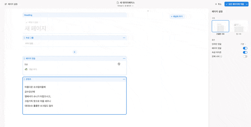 페이지 댓글 섹션을 콘텐츠 섹션 아래로 옮긴 뒤, 모든 페이지에 적용을 눌러줘