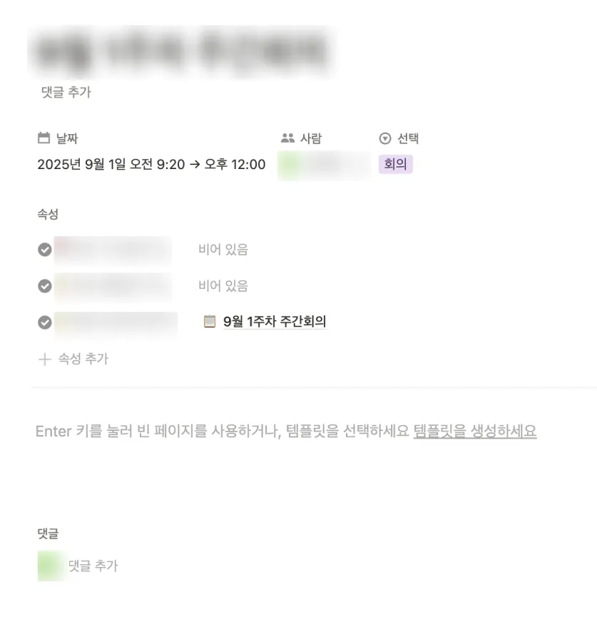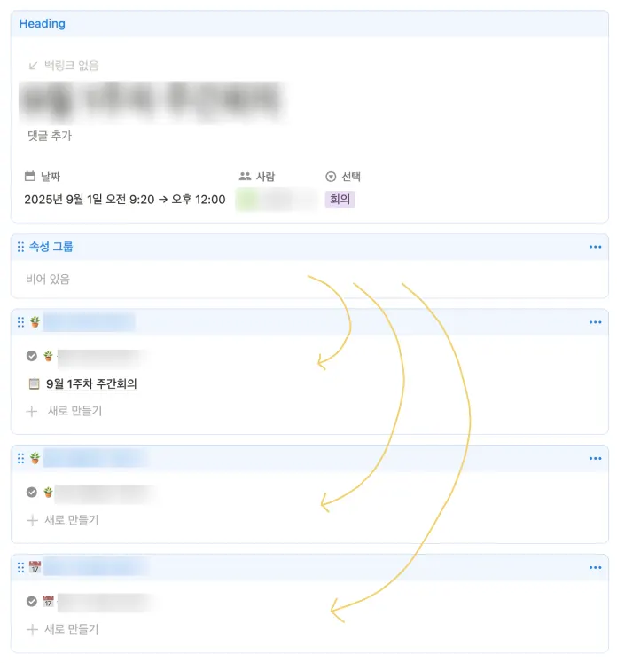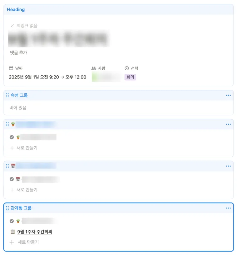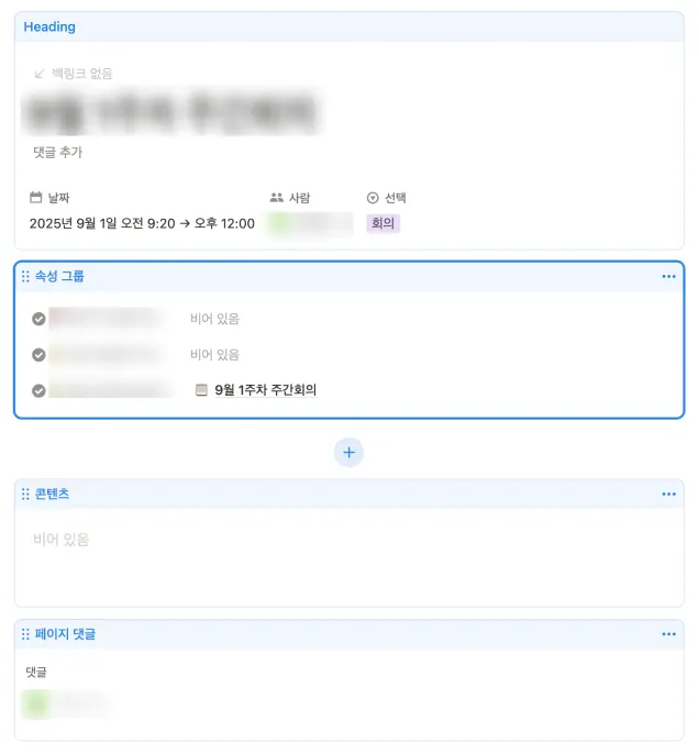 기본적으로 이런식으로 보이게 될거야. 헤딩, 속성 그룹, 콘텐츠, 댓글로 구분되어 있어.