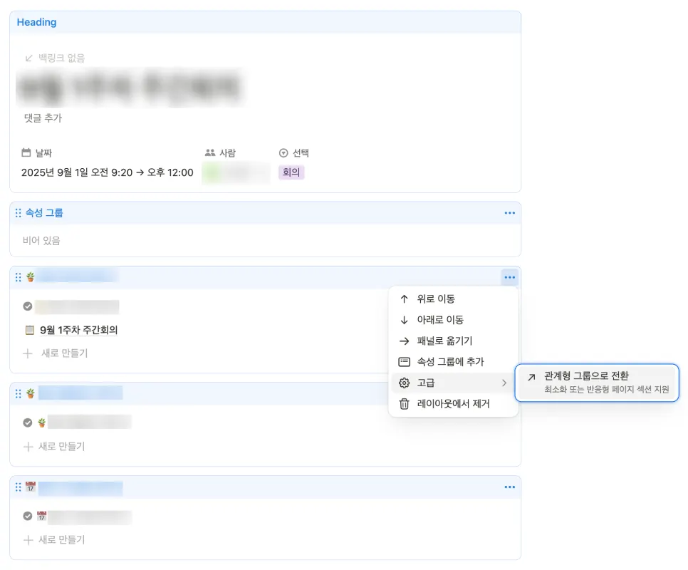 여기서 각 속성의 박스 오른쪽 상단의 […] 을 눌러 [고급] > [관계형 그룹으로 전환] 을 적용해줘.