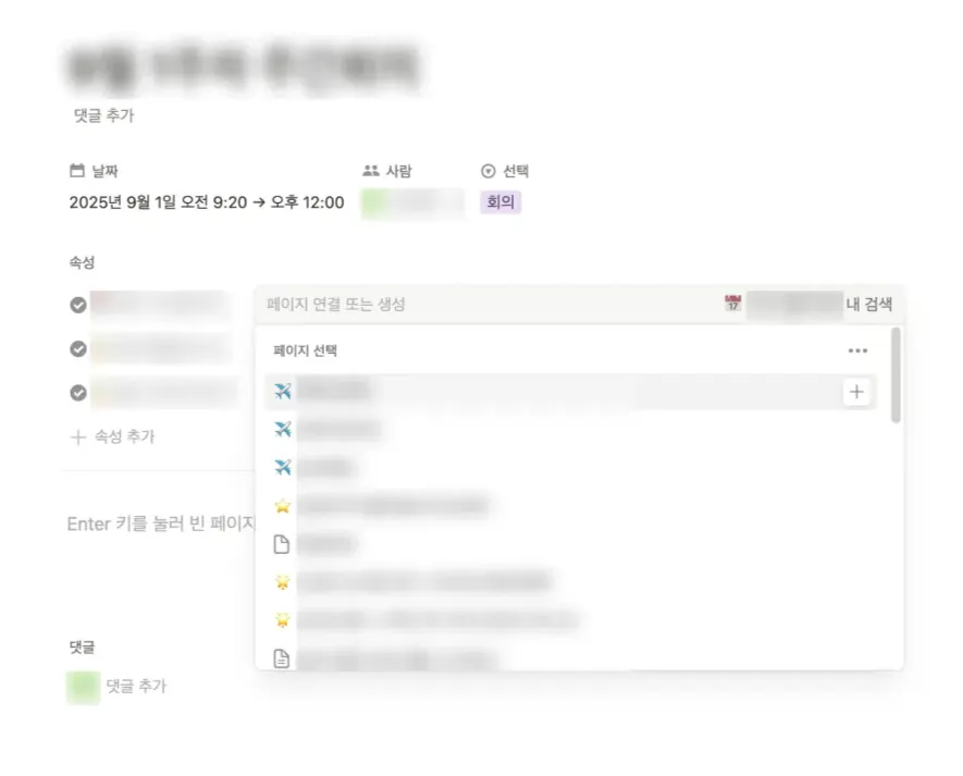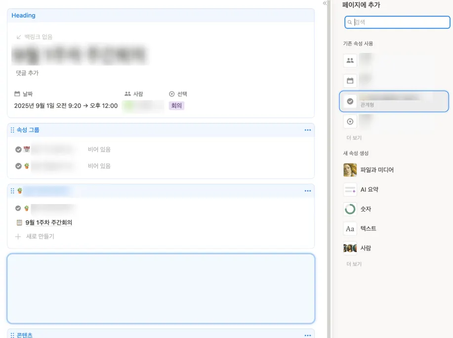 그러면 오른쪽에 [페이지에 추가] 가 나오면서, 기존 속성을 선택할 수 있어.