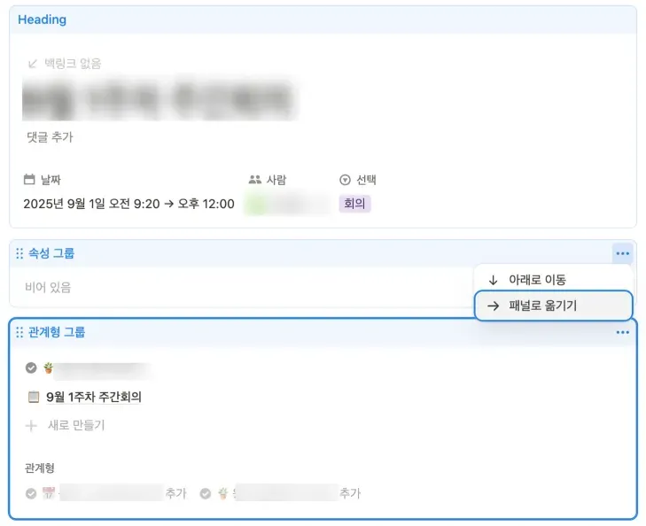 패널에 숨긴 속성들은 페이지 제목 아래에 [세부정보 보기] 버튼을 누르면 오른쪽에 패널이 나타나!