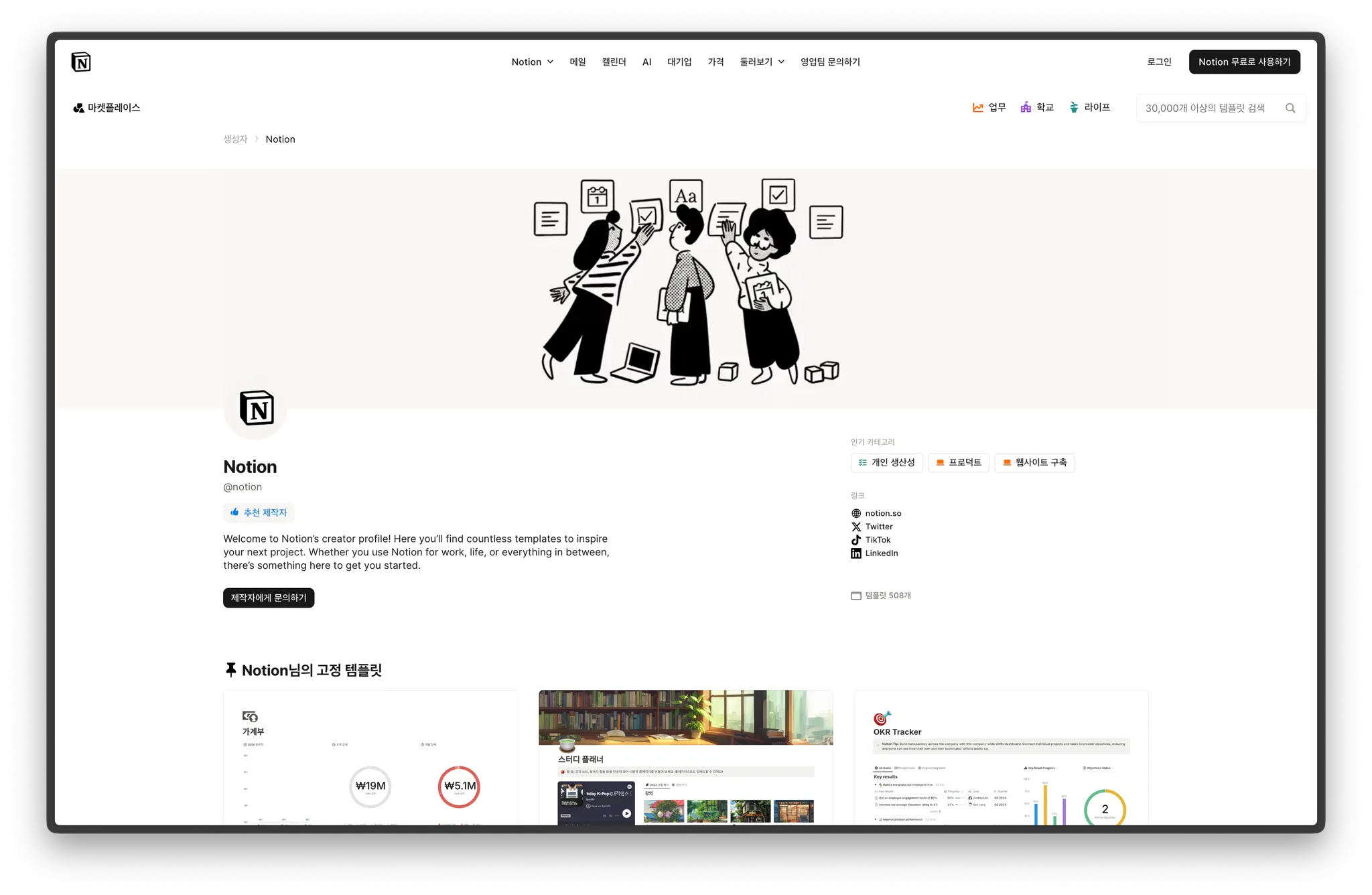 아마도 Notion 마켓플레이스에서 설정한 카테고리 별로 템플릿이 추천되는 것 같더라고.