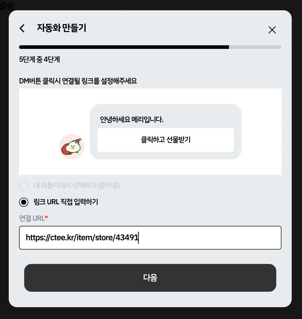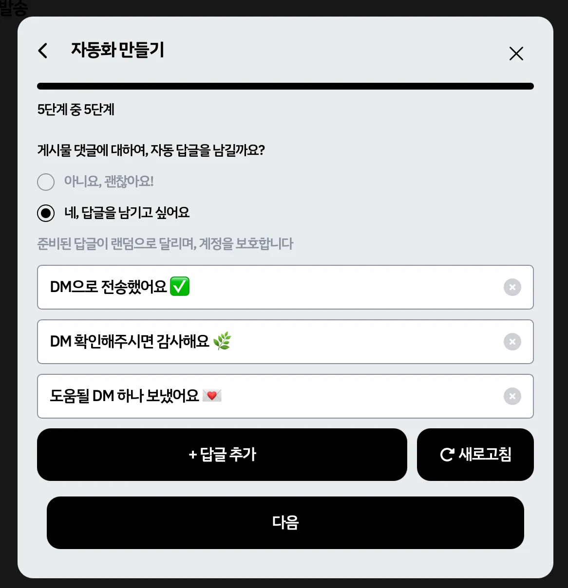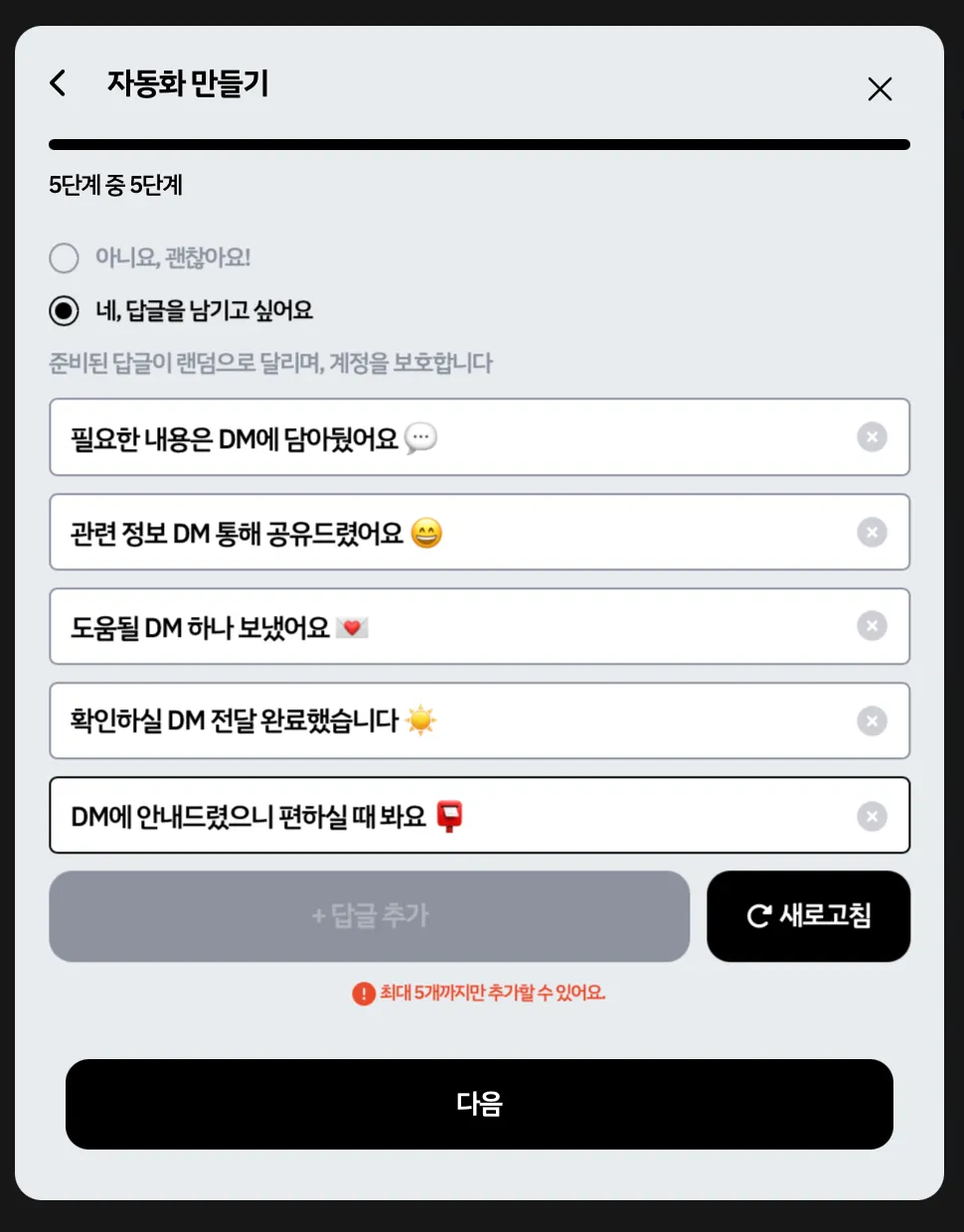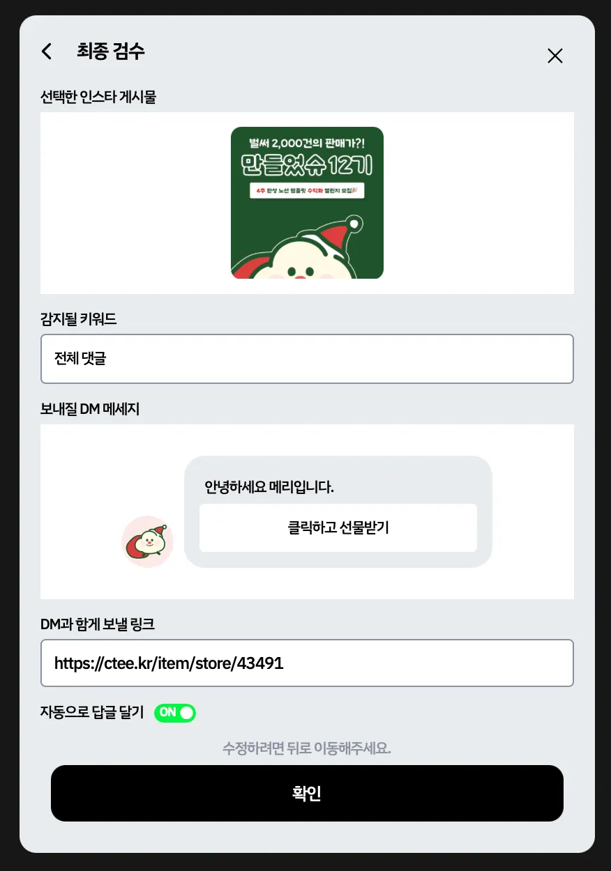 아래 내용은 자세한 설명이 없는 자동 DM 설정 과정 캡쳐본입니다.