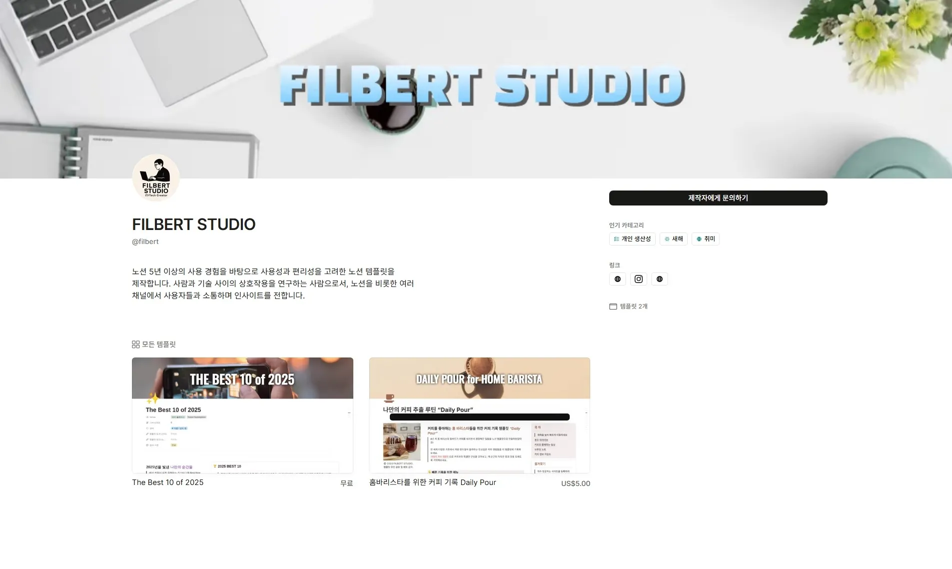 안녕하세요. 노션 공식 템플릿 제작자 필버트 (Filbert)입니다.