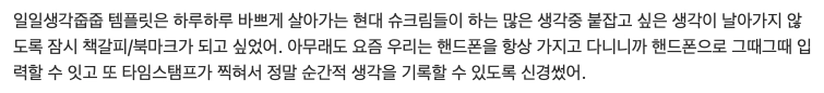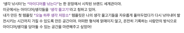 나는 그런 경험에서 ‘흘러가 버리는 생각을 한 곳에 모아두고, 다시 꺼내 발전시킬 수 있으면 좋겠다’ 생각하면서 템플릿 영감을 얻게 됐어! ദ്ദി(•̀ ᗜ <)