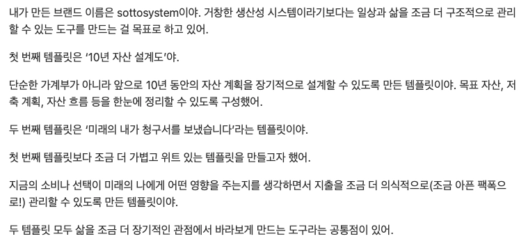 그래서 나와 비슷한 상황에 처한 다른 사람을 돕고 싶은 생각에 템플릿 상품화를 결정했어! ദ്ദി(• ˕ •マ.ᐟ