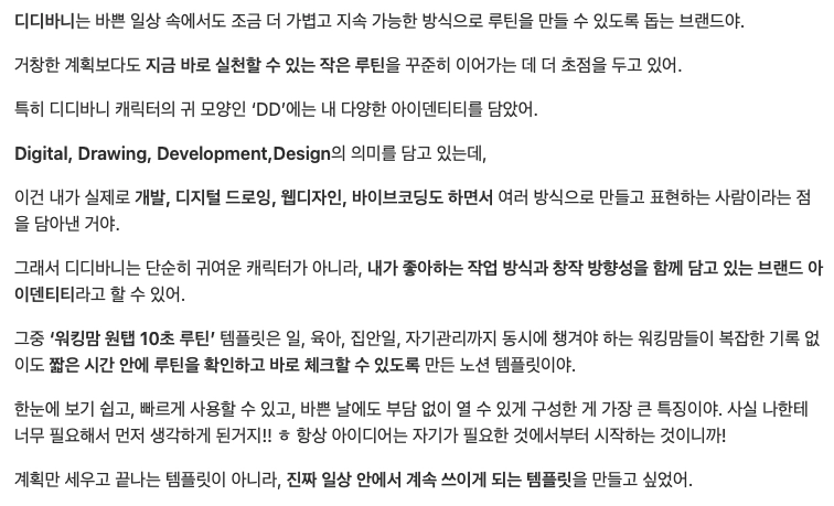 특히 나는 그 아이디어로 만든 템플릿을 직접 사용해보면서 자주 쓰게 되는 템플릿을 찾았고, 제작자의 의도는 전달하되 사용자의 편의성을 고려하면서 수정을 반복해 템플릿을 완성했어! ദ്ദി ´꒳`)ノ⁾⁾